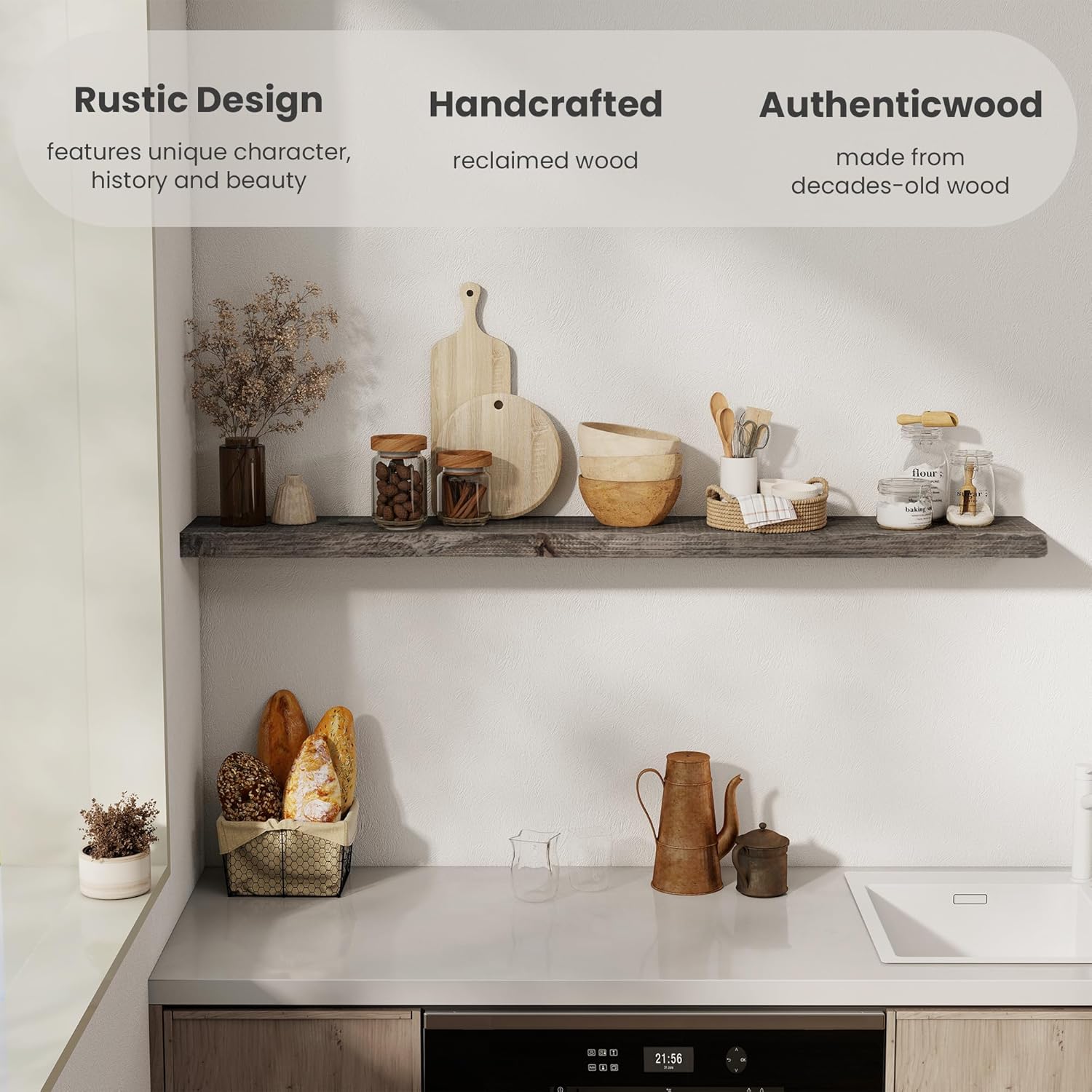 Solid Wood Floating Shelves, 8" Deep Rustic Reclaimed Barnwood Wall Hanging Floating Shelf with Invisible Heavy-Duty Metal Bracket | Wall Mounted | Farmhouse Style | 55 inches,1PC,Grey