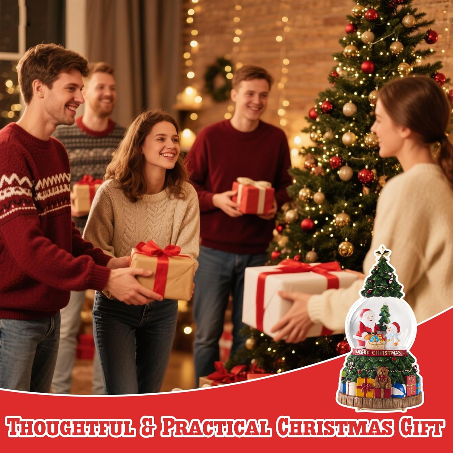 - 🎄☃️【 Exclusive Design 】Crafted from premium resin, this exquisitely designed Christmas tree features intricate carvings of festive elements (gifts, candies, teddy bears) around both the tree and its base. The snow globe interior showcases a unique Christmas scene with Santa Claus and a snowman exchanging gifts – a truly one-of-a-kind product on the market. Two Modes "Turn on the switch for Mode 1: Lights + Music. Press the switch again for Mode 2: Lights Only."