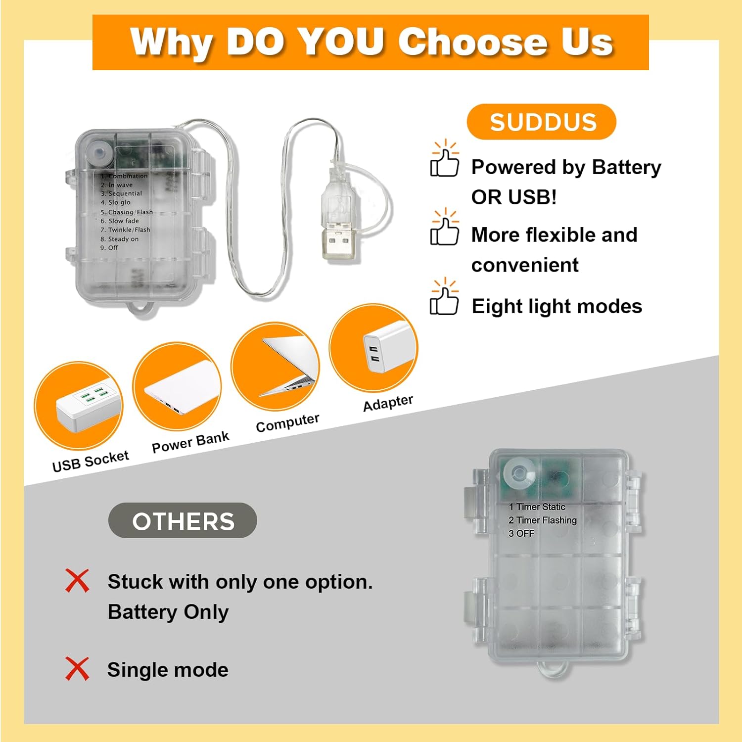 - [DUAL POWER FREEDOM: USB + BATTERY]: No outlets by the nursery corner? Hosting outdoor parties? Our versatile fairy lights solve it all with a 2-in-1 power system. Plug into USB for a continuous glow or use batteries (3xAA not included) for a completely cordless setup. Now you can decorate gardens, weddings, or balcony cafes without limitations—unlike restrictive single-power fairylights.
