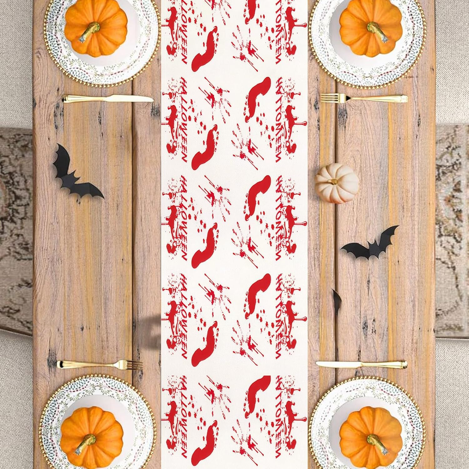 - Creating a Halloween Festive Atmosphere: This product features bright red bloodstains and footprint patterns, making it the perfect decoration for Halloween dining tables, suitable for daily dining and party dinners