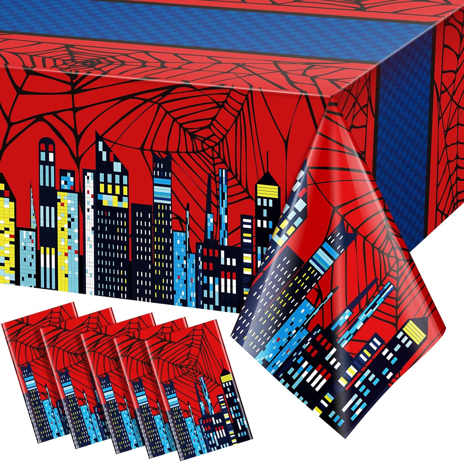 - Spider Party Design: Featuring a vibrant red and blue color scheme with spider webs and a bold city skyline, these tablecloths add instant excitement to spider themed birthday parties or comic inspired events