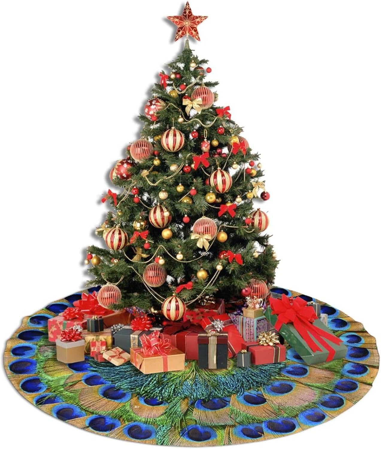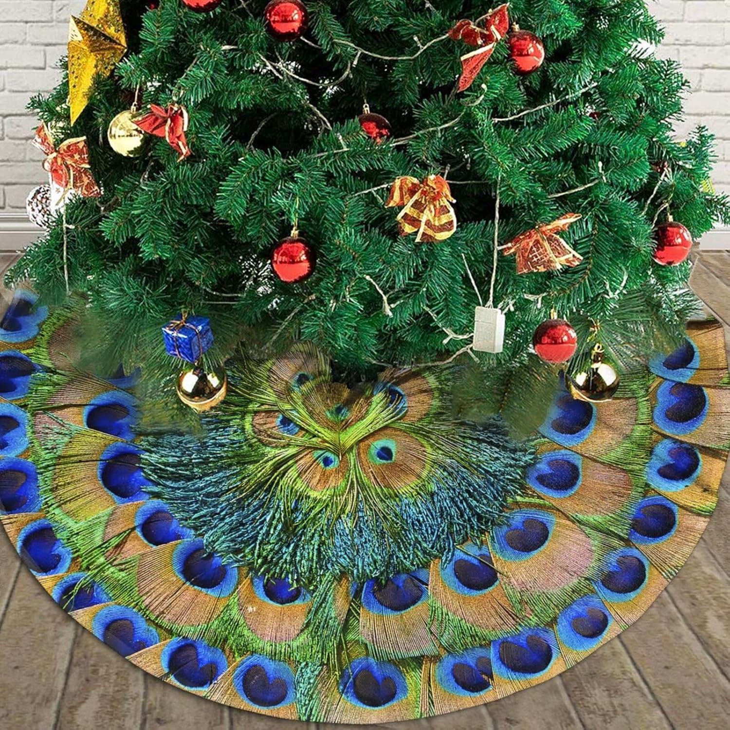 Christmas Tree Skirt,Peacock Feathers Circle Xmas Tree Skirt Rustic Farmhouse Tree Skirt for Christmas Decor Xmas Holiday Home Party Decorations48