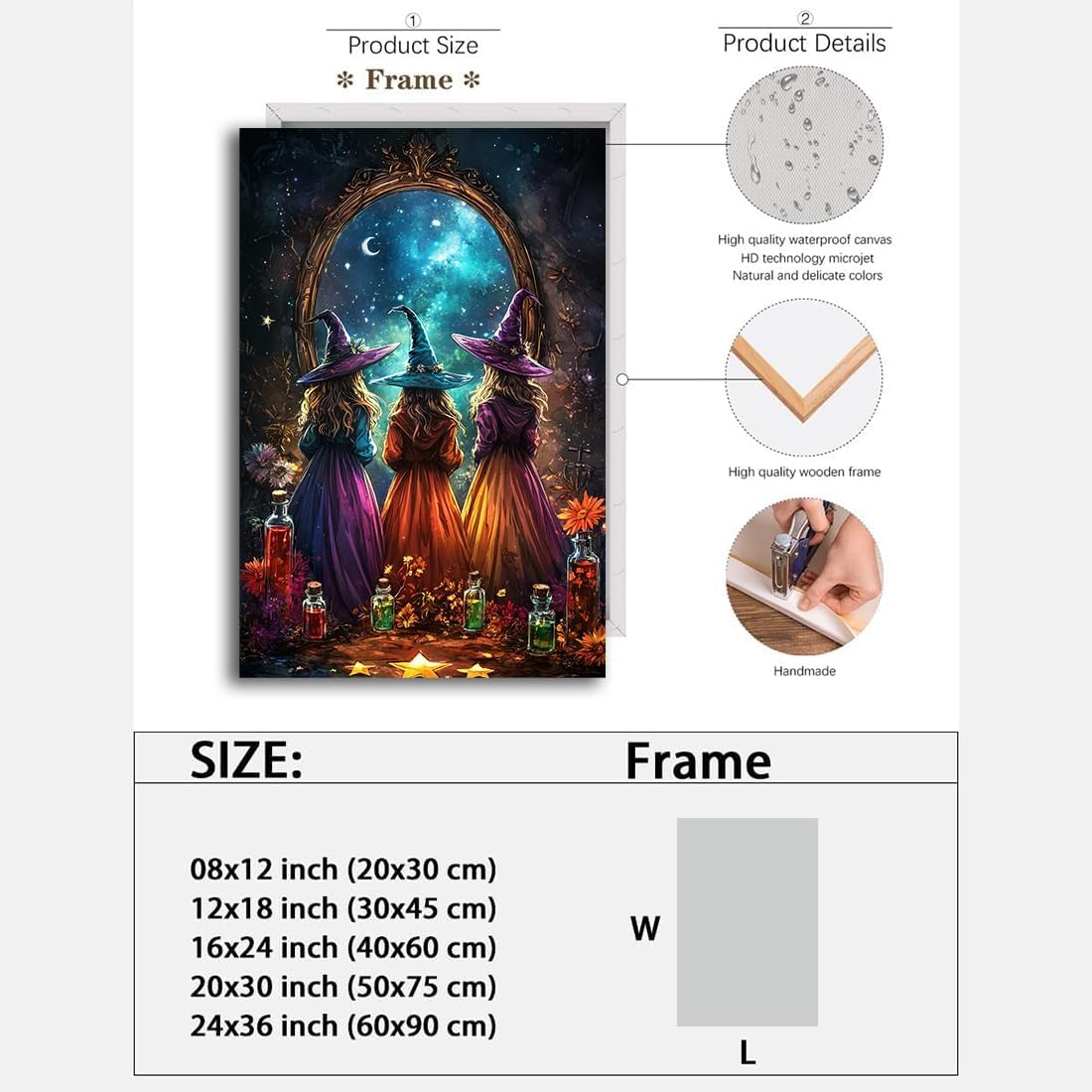 Witch Poster Halloween Fall Wall Art Decor,Three Witches with Magic Potion Mirror Colorful Vintage Print,Dark Academia Spooky Canvas Art Prints for Home Living Room,16"x24" Framed