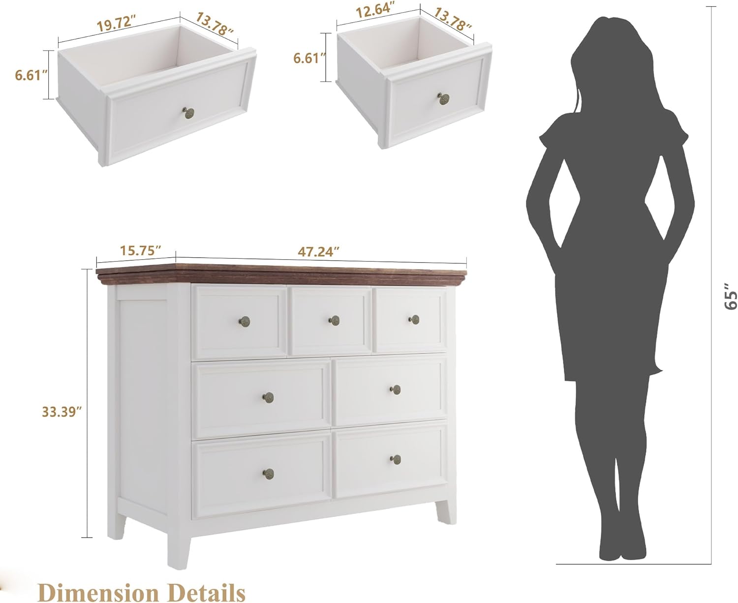 - ăPerfect size for RoomăThe size of the assembled dresser measures 15.75"D x 47.24"W x 33.39"H to accent any wall. The smaller drawer measures 13.78"D x 12.64"W x 6.61"H and the bigger drawer measures 13.78"D x 19.72"W x 6.61"H to store a variety of items