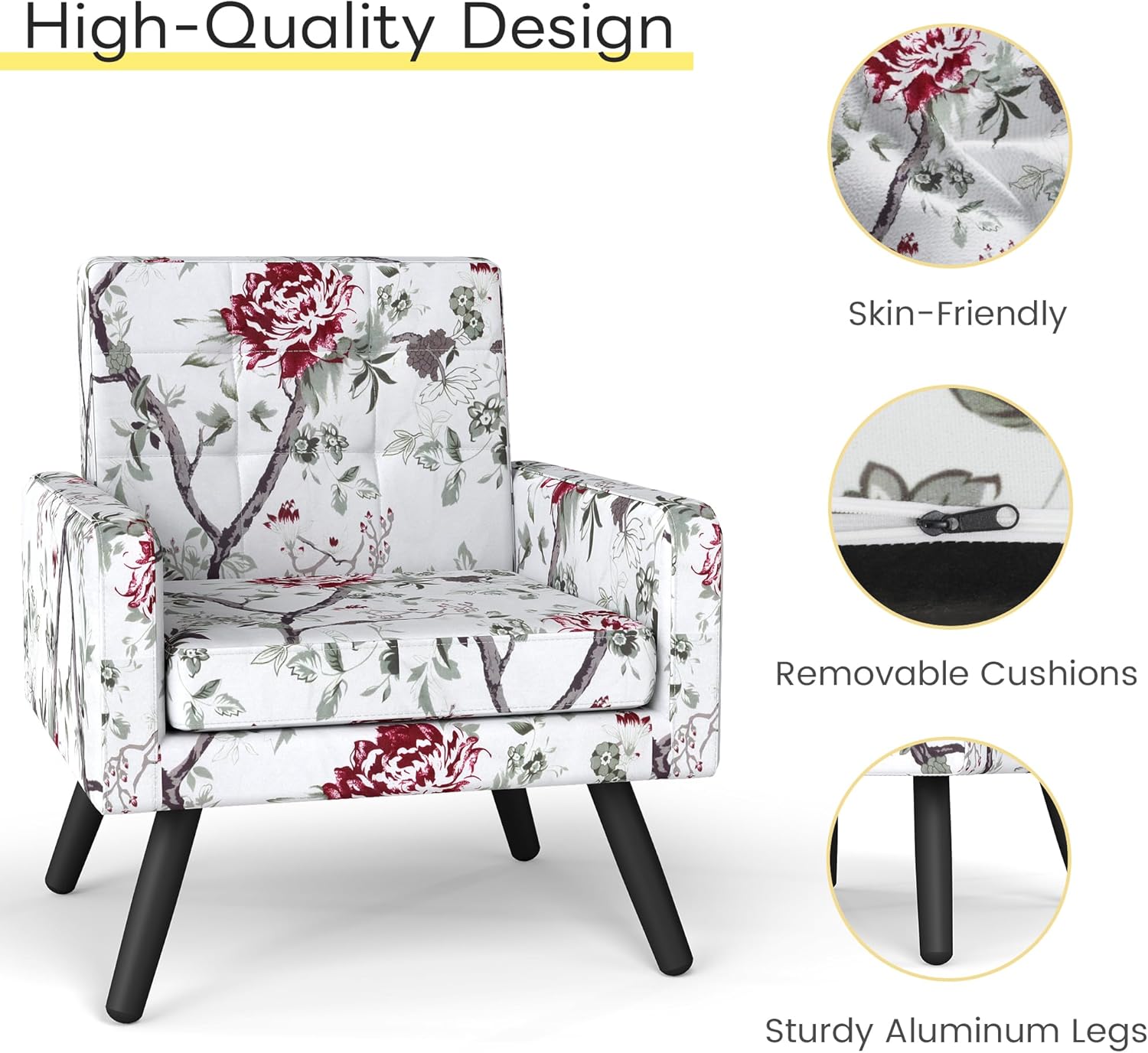 Kromax Mid-Century Modern Accent Chair for Living Room, 496 Lb. Weight Capacity, Dual Armrests, Comfy Extra Large Seat, Timeless Style Perfect for Reading & Relaxing, Red Floral